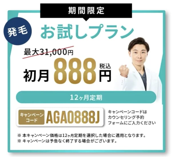 AGAヘアクリニックの診察を予約する際、カウンセリング予約フォームのキャンペーンコード欄に「AGA0888J」と入力すると、お試しプランが初月888円になります。