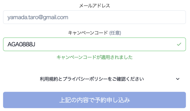 クーポンコード入力後、正しく入力されていれば「キャンペーンコードが適用されました」と表示されるので、確認後に予約申し込みボタンへ進みましょう。