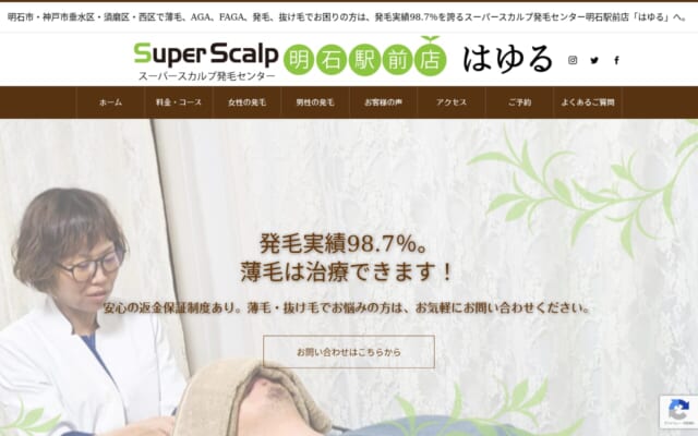 スーパースカルプ発毛センター明石駅前店「はゆる」は、薬を使わない発毛施術に特化した発毛サロンです。