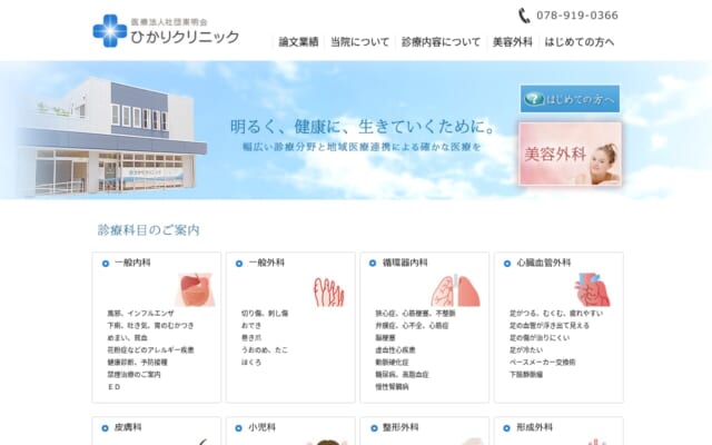 ひかりクリニック美容外科は、内科・外科・循環器内科・心臓血管外科・整形外科・形成外科・皮膚科・小児科に対応する総合クリニックで、美容外科も併設されています。
