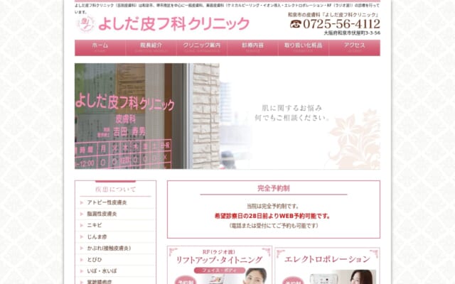 和泉市内に位置するよしだ皮フ科クリニックは、一般皮膚科・美容皮膚科を併設する地域密着型のクリニックです。
