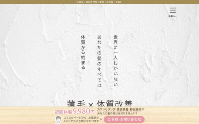 鍼灸・整体による体質改善と頭皮環境改善を行います。AGA、びまん性脱毛症、円形脱毛症など幅広く対応しており、完全予約制・完全個室でプライバシーにも配慮されています。初回9,980円で体質検査と施術を受けられ、発毛コースは18,700円〜24,200円/回です。