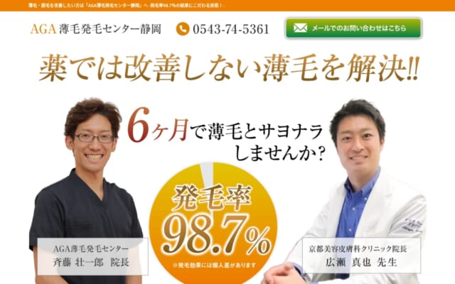静岡県内で薄毛治療の症例写真数No.1を誇るAGA専門クリニックです。フルオーダーメイド治療を行っており、一人ひとりの進行度に合わせた最適な治療プランを提案してくれます。