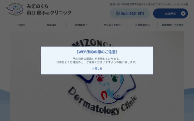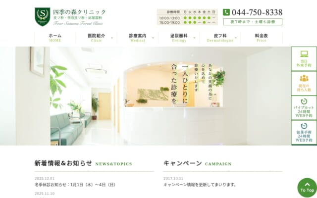 皮膚科:9:30~12:30、14:30~18:00(水曜・日祝休診、土曜午後休診)/ 内科:月・木・金・土9:30~14:00、火14:30~18:00