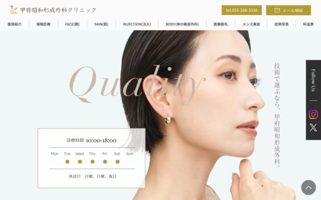 韮崎駅から中央本線で約15分の甲府駅から徒歩圏内にある美容クリニックです。統括院長自身が10年以上AGA治療を継続している実体験に基づいた診療が特徴で、カウンセリングは無料です。