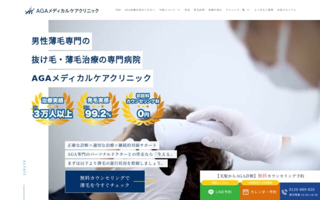 AGAメディカルケアクリニックは、AGA治療専門医による主治医制度を採用しており、発毛実感率99.2%という高い実績を誇るクリニックです。完全個室・完全予約制でプライバシーが守られ、毛髪診断士®によるカウンセリングも受けられます。