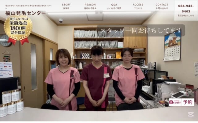7.福山発毛センター ![]() | ▼料金 予防:薬を使わない発毛療法のため、フィナステリド処方なし/月 発毛:薬を使わない発毛療法のため、ミノキシジル処方なし/月 ▼アクセス: 福山駅から車で約10分 | 初回カウンセリング+施術体験:4,980… | フィナステリド 薬を使わない発毛療法のため、フィナステリド処方なし | フィナ+ミノキシジル 薬を使わない発毛療法のため、ミノキシジル処方なし | 平日9:00〜12:30、15:00〜19:00 / 土曜9:00〜14:00(木曜午後・土曜午後・日曜・祝祭日休診) |