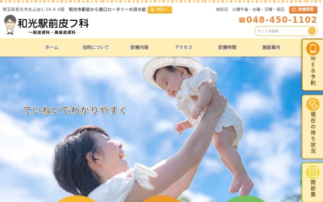 和光市役所から徒歩圏内で、市役所での手続きのついでに立ち寄ることも可能です。開院17年の実績があり、地域に根ざした信頼できる皮膚科クリニックです。