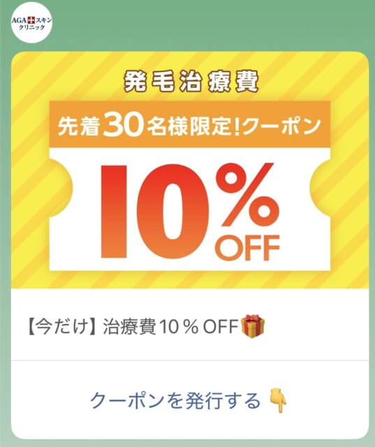 AGAスキンクリニックの公式LINEを友だち追加すると、追加時や誕生日に治療費が割引になるクーポンが発行されます。