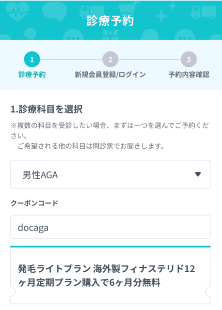 - 一番最初の「1.診療科目を選択」の部分にクーポンコードを入力