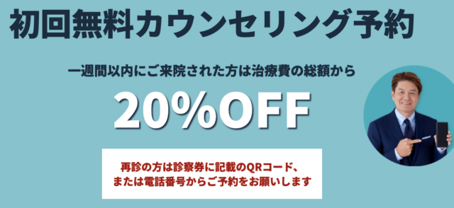 - 診察予約から1週間以内の来院で20%オフ